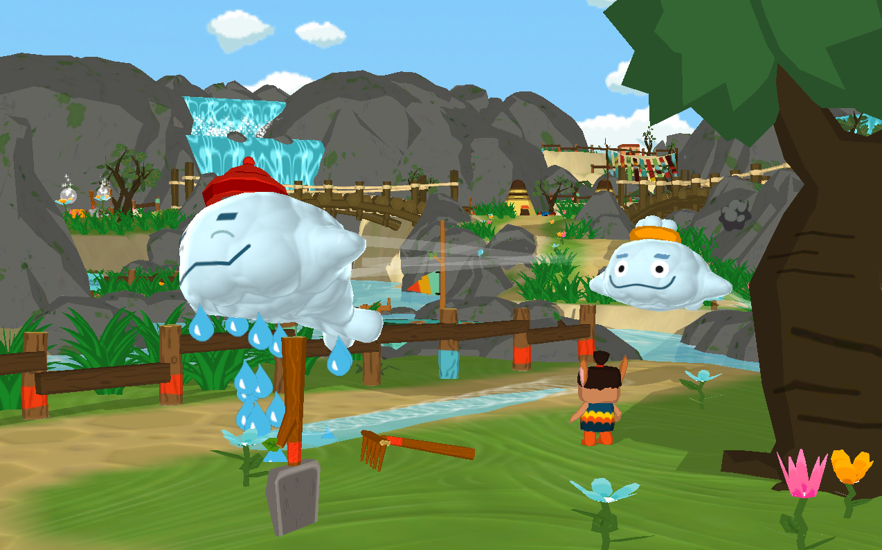 Kumulo and Nimbe can manipulate all manner of liquids and small objects, from pools of water and acorn seeds to vats of oil and exploding fire nuts. In addition, there are four Cloud flying heroes, each with their own unique ability, that can hitch a ride on the back of Kumulo or Nimbe and use their powers to combat the Doza foe, or solve many of the bamboozling puzzles that you encounter throughout the world.