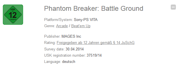 5pb.’s Phantom Breaker series has a weird history in North America and Europe. The root of the franchise is a fighting game that originally debuted as an Xbox 360 release in Japan in 2011. This version of the game was announced for a western release via Southpeak’s 7Sixty publishing label, but never actually came out. 5pb. would later put out revisions of the game for the arcades, PS3, and 360 market in Japan. Despite the series’ origins not seeing an English release, the company decided to publish its Xbox Live Arcade beat’em up spinoff, Phantom Breaker: Battlegrounds, globally. This game was ported to PS Vita earlier this year in Asia, and an entry from Germany’s USK ratings board indicates that the game is going to be released internationally.